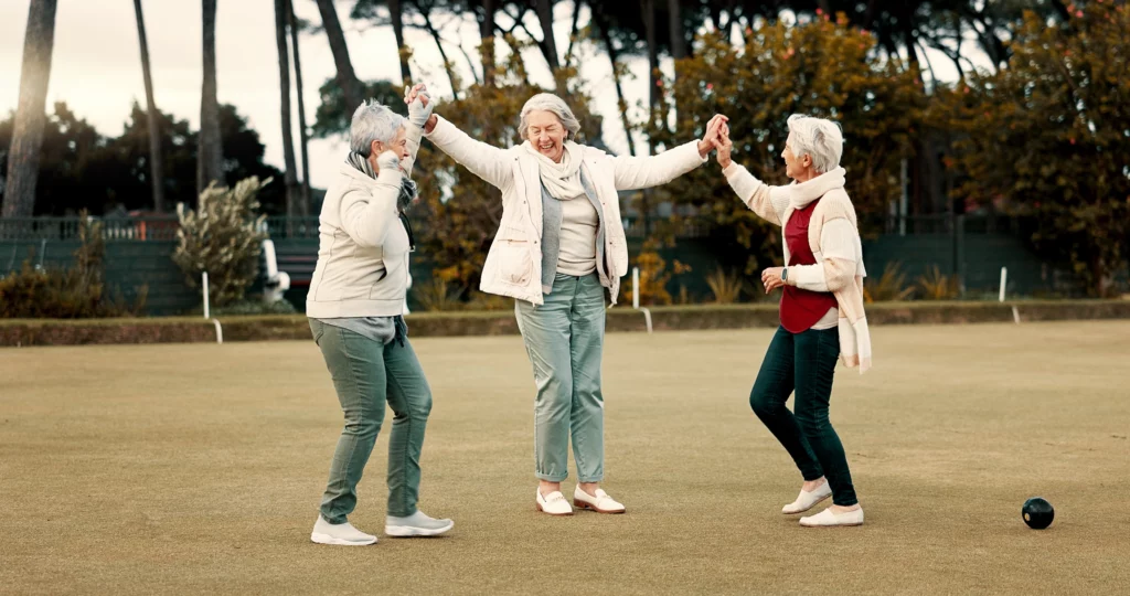 Senior women celebrating while playing bocce ball